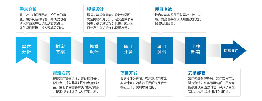 從項目策劃、架構設計、視覺設計到前後端技(jì )術開發,提供全程化、一體(tǐ)化服務(wù)模式。